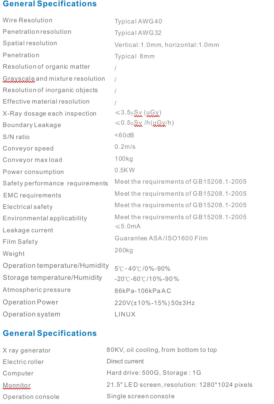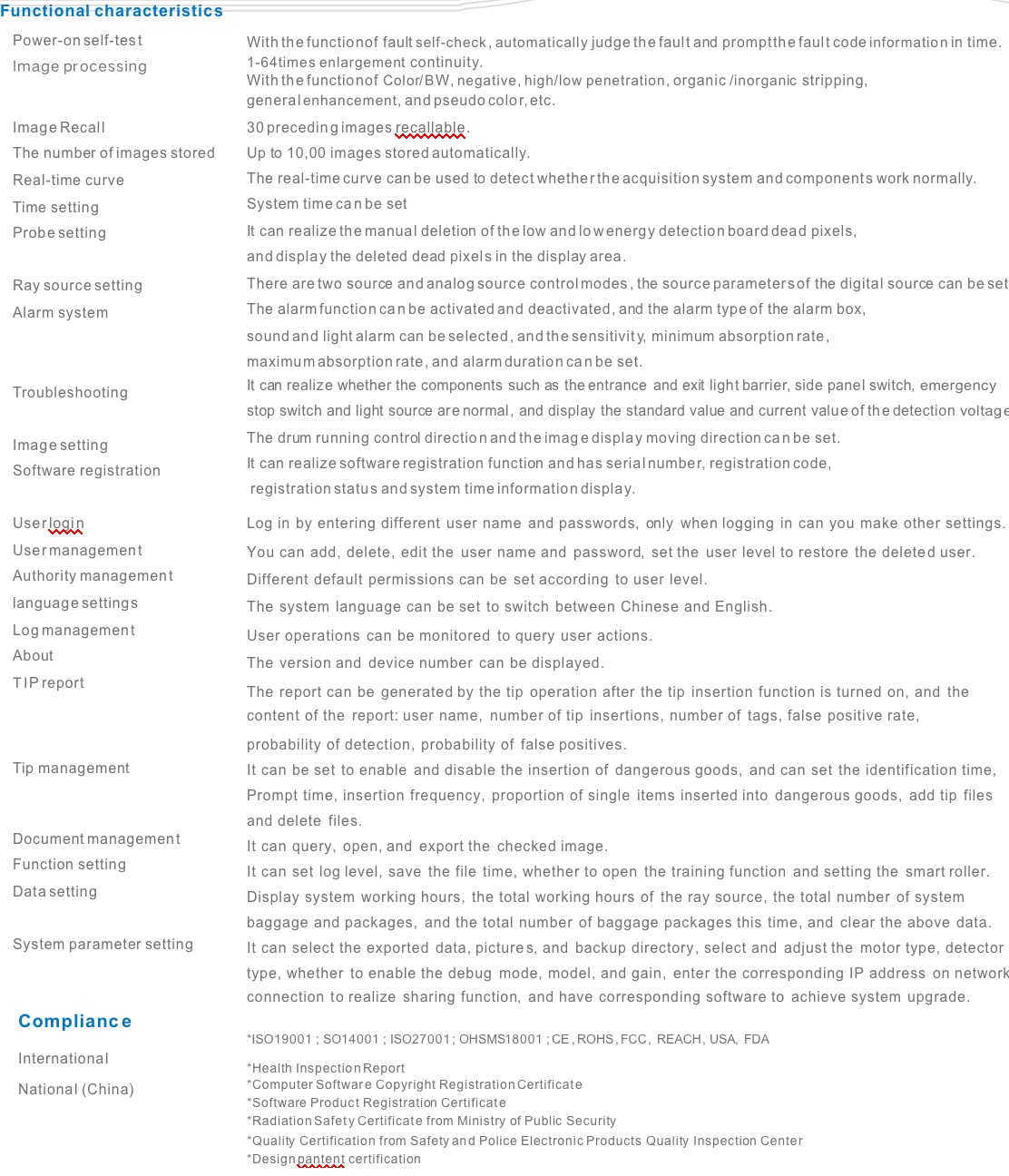 • Funciones del sistema:Autoprueba de encendido, gestión de usuarios de varios niveles, gestión de imágenes, gestión de imágenes, diagnóstico de la curva, diagnóstico de teclado, consulta de información de dispositivos, exportación de imágenes multiformato, función de operación OSD, reflejo de imágenes, 1-16 veces la ampliación continua, aumento Vidrio, entrenamiento del operador, posicionamiento preciso de las imágenes de paquetes, recordatorios de canales vacíos, software de operación remota, apagado de un botón y motor de rodillos inteligente (opcional).